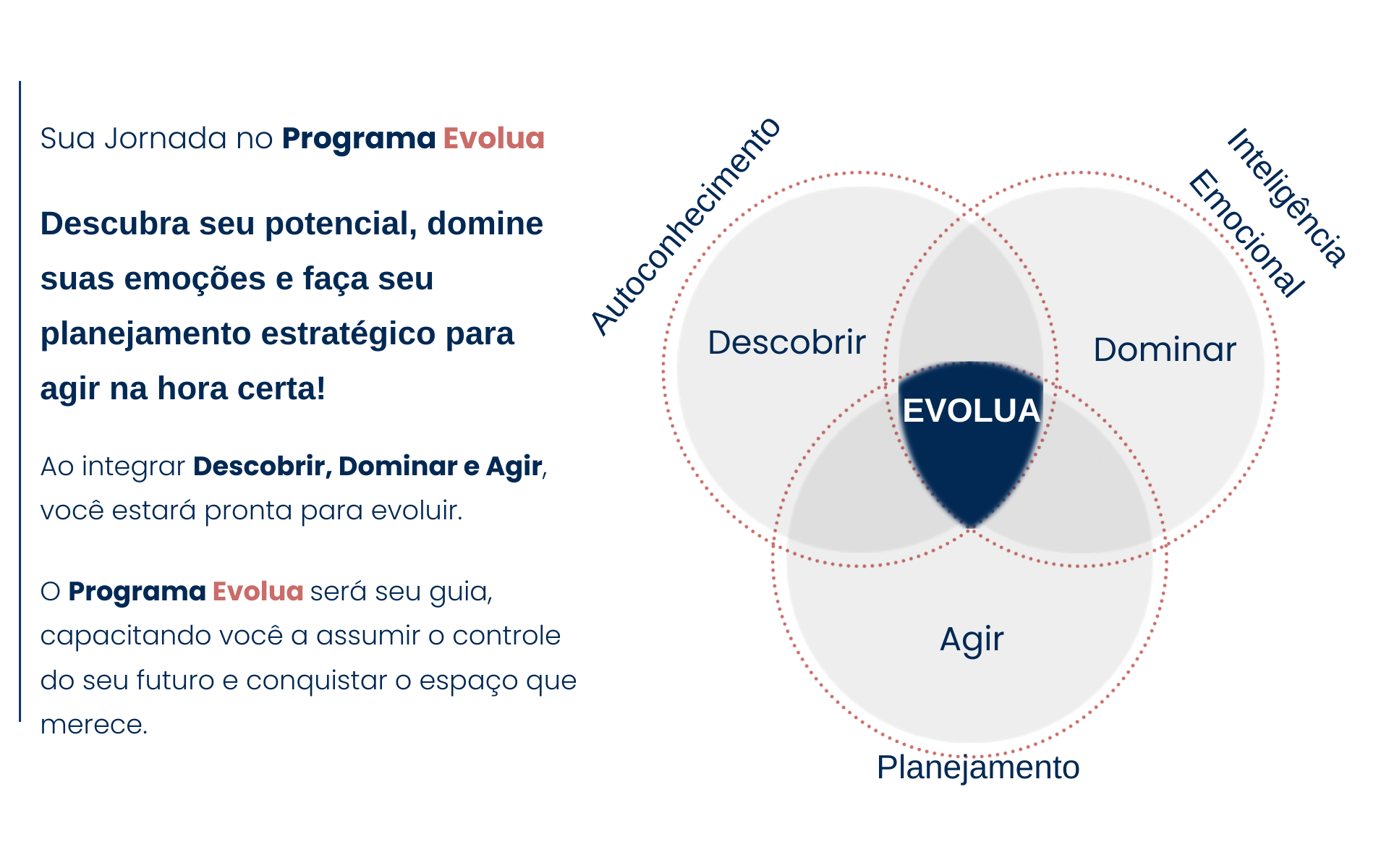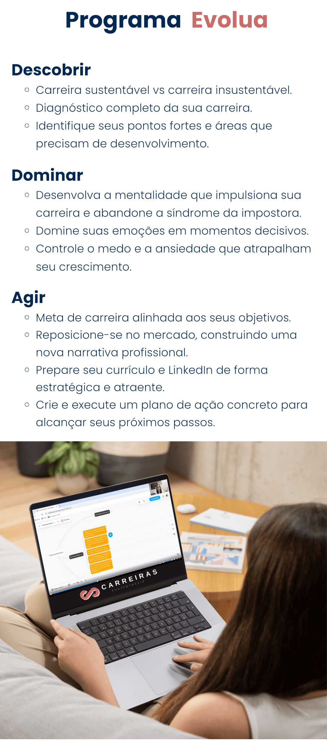 No Programa Evolua você vai aprender como criar um plano de recolocação estratégico, sem abrir mão da sua saúde mental ou passar meses perdida em tentativas frustradas.