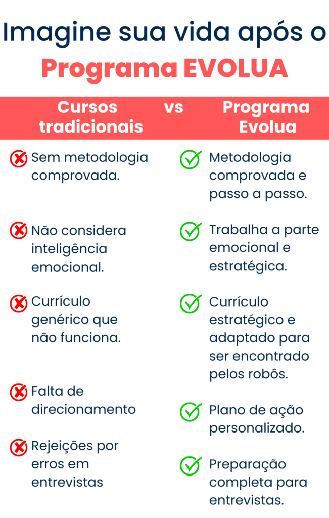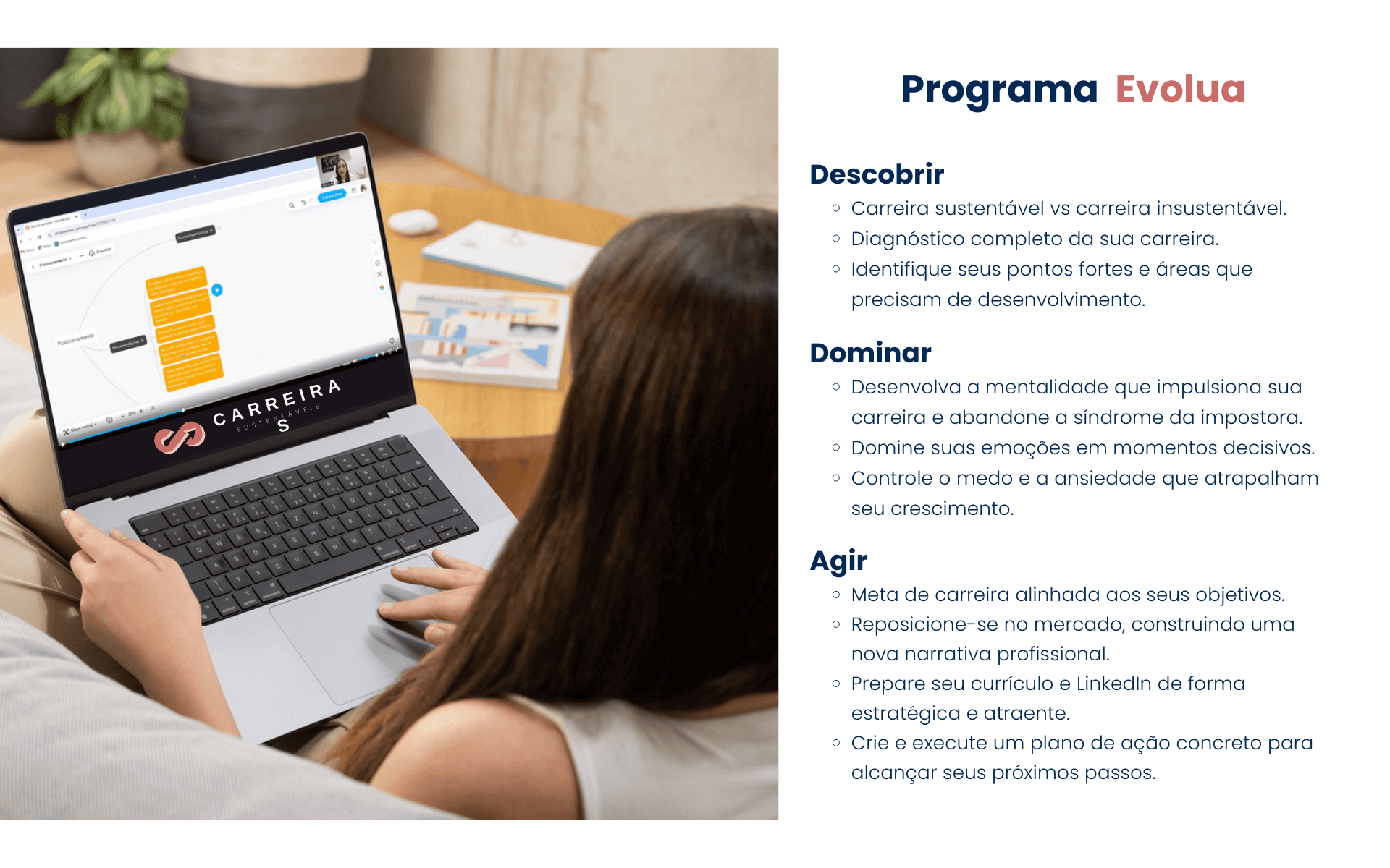O EVOLUA não é apenas mais um programa de carreira. Ele foi desenhado para te ajudar a transformar sua jornada profissional de dentro para fora.
