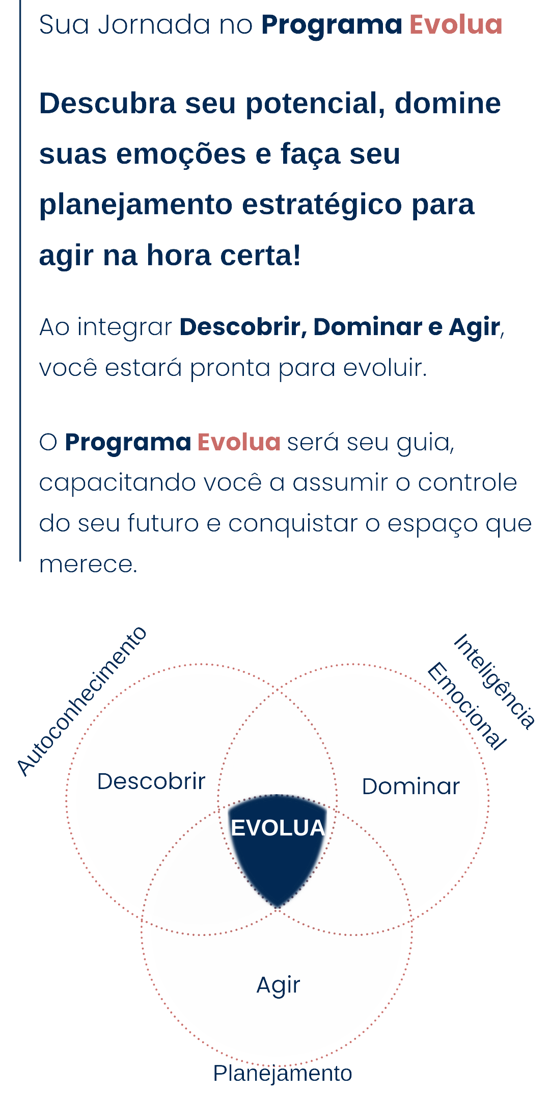 Hoje, ajudo mulheres como você a não cometerem os mesmos erros que eu cometi. A minha missão é te mostrar que existe um caminho para o sucesso profissional sem sacrificar sua vida pessoal, sua saúde mental e, principalmente, seu valor. Eu desenvolvi o Programa EVOLUA exatamente para te guiar nesse processo, porque eu sei que você é capaz de conquistar muito mais do que está vivendo agora.”
